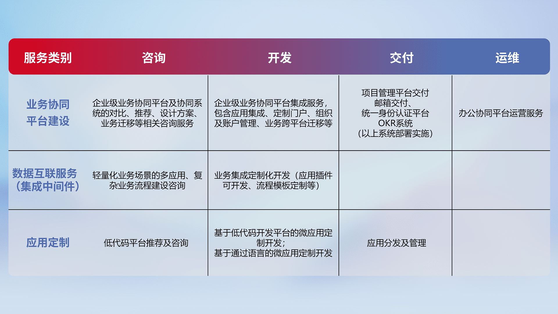 针对钉钉、、、企微、、IDaas等平台级产品提供产品的规划、、、方案、、交付、、、、定制化开发等服务,,,实现如统一协同办公、、智能客户服务、、、混合会议管理、、、智能数据查询、、、等业务场景,,,,实现数字化转型。。。